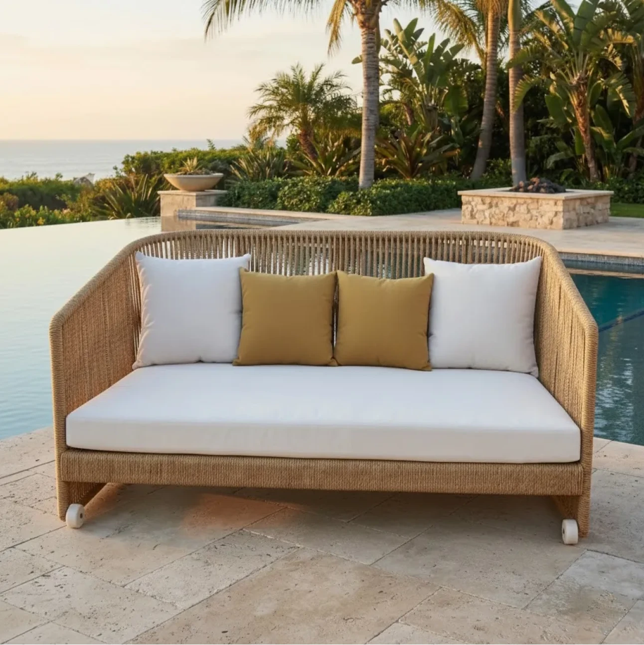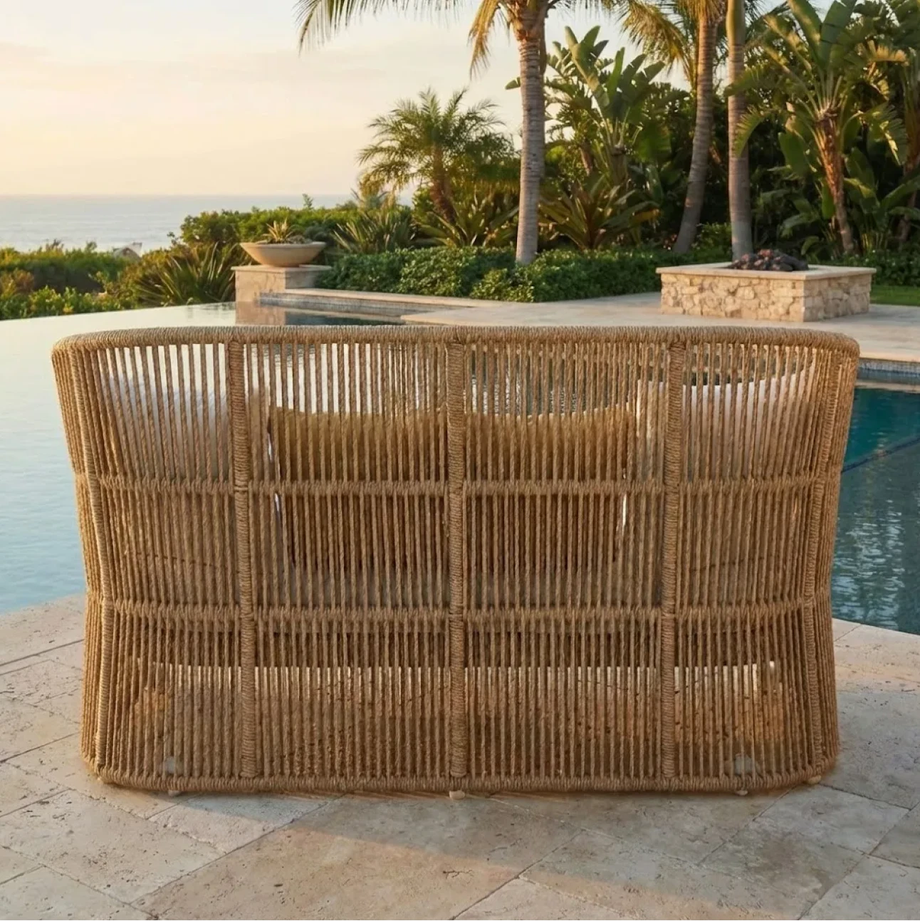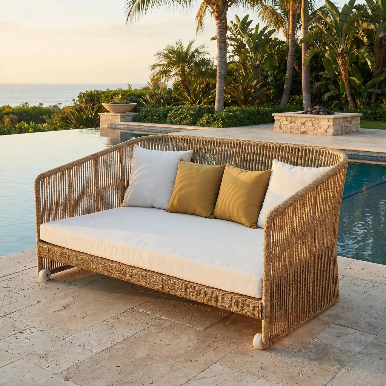 Bitta features a structured yet inviting form inspired by natural textures and coastal living. Crafted with a woven rope frame, generous seat cushion, supportive back cushions, and a solid teak base, it offers spacious comfort, visual warmth, and a balanced silhouette designed for relaxed outdoor lounging.