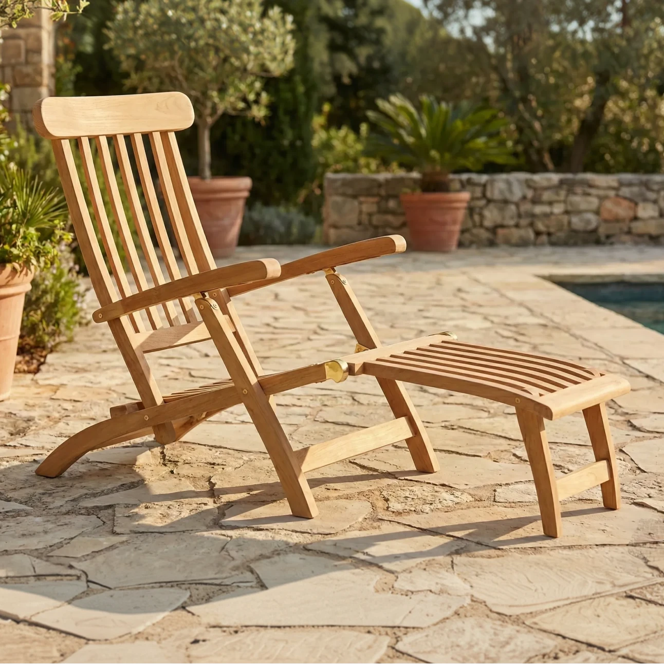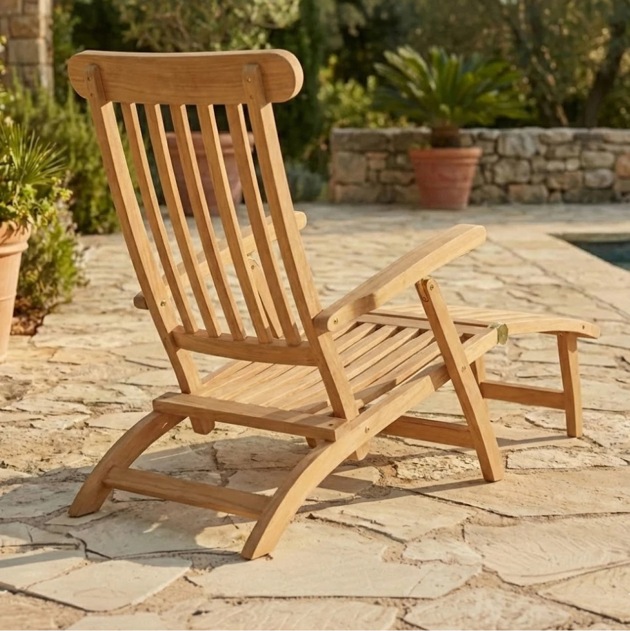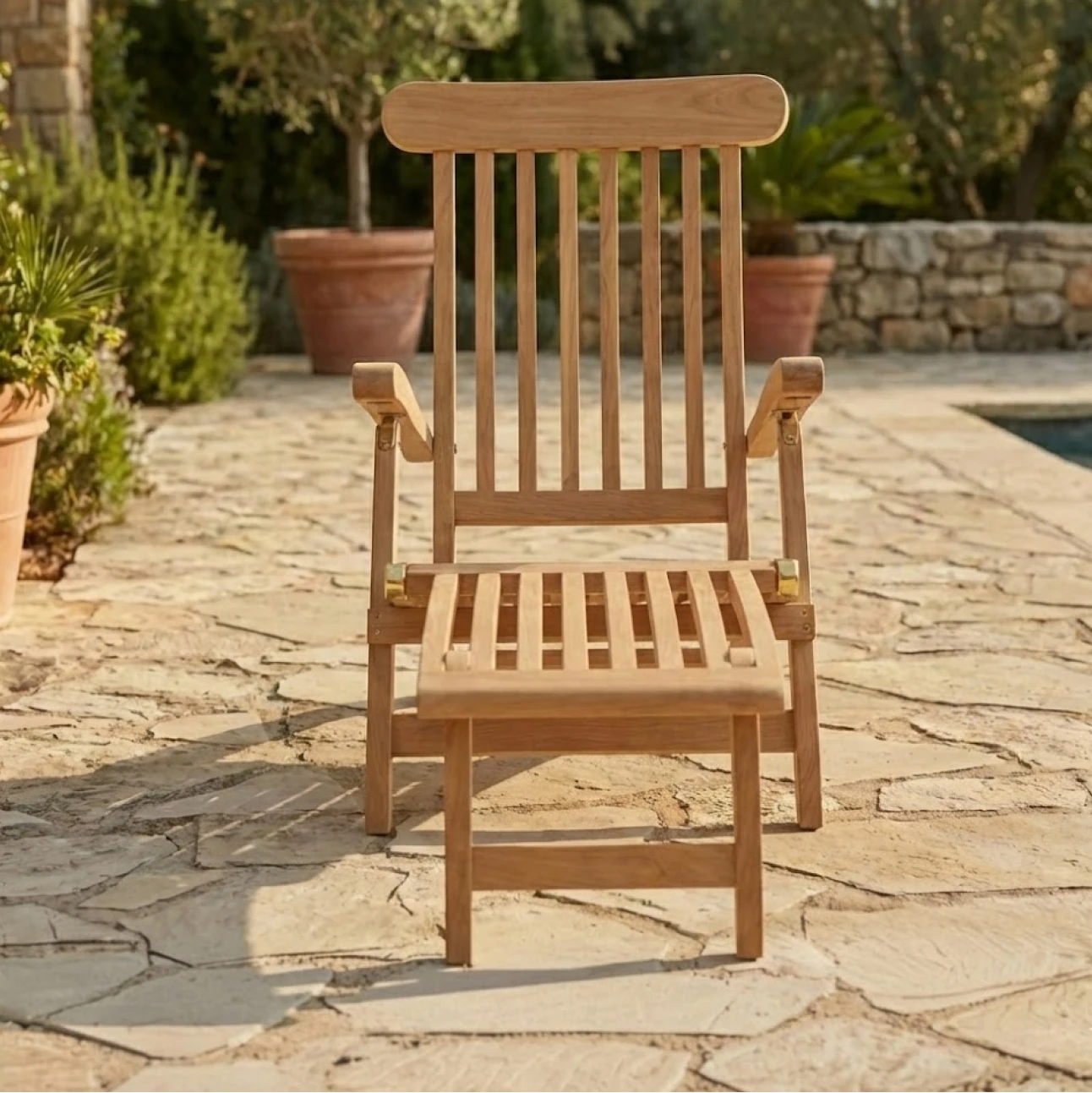 Classic Lounge Chair embodies traditional outdoor comfort with a reclined form built for rest and ease. Crafted entirely from solid teak, its slatted backrest and seat promote airflow, while adjustable positioning, wide armrests, and a matching footrest provide supportive, ergonomic lounging for extended outdoor use.