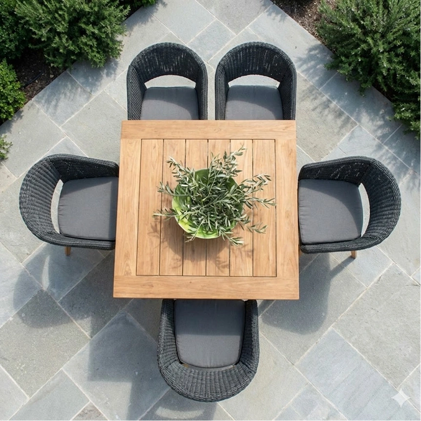 Devi Set is a cohesive outdoor dining composition designed for balanced comfort and visual harmony. Combining a solid teak table with matching woven rope chairs, the set offers durability, ergonomic support, and a unified aesthetic that feels structured yet relaxed for everyday dining experiences.