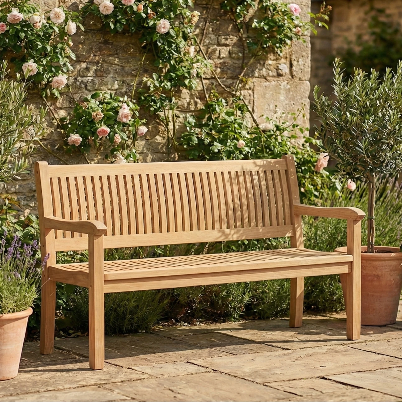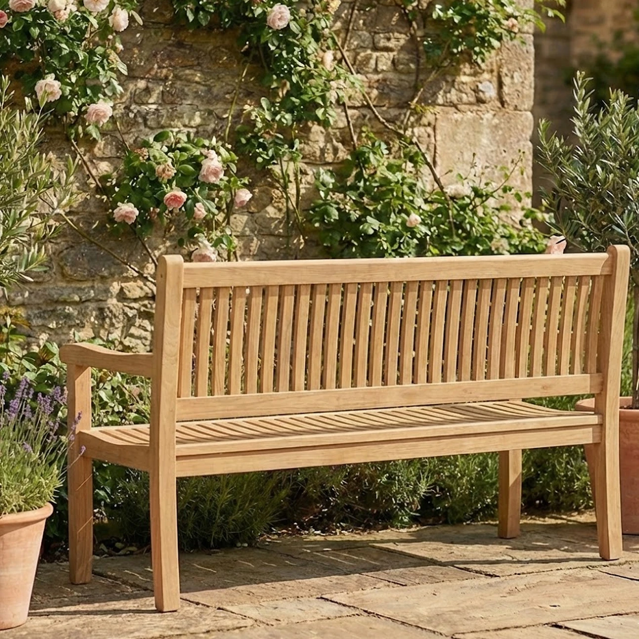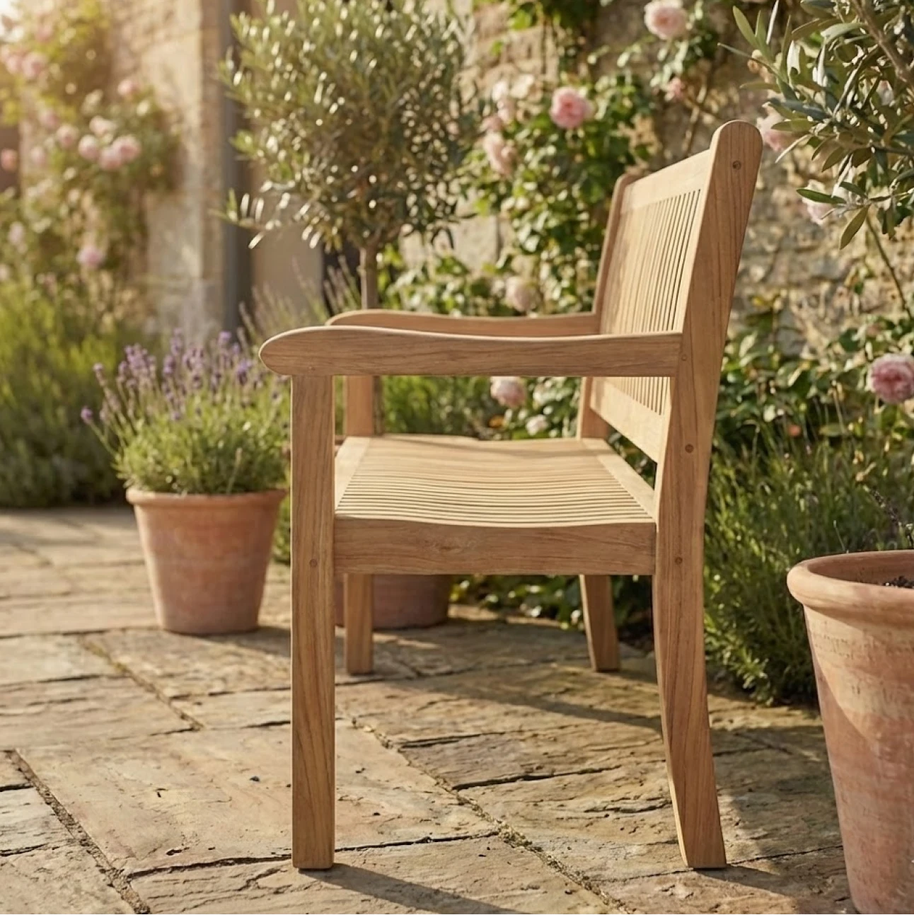 Garden Bench features a classic, well proportioned form designed to bring comfort and structure to outdoor spaces. Crafted entirely from solid teak, its slatted backrest and seat provide durability, natural ventilation, and a timeless aesthetic that feels grounded and familiar.