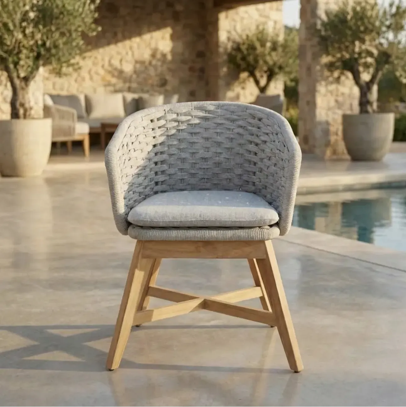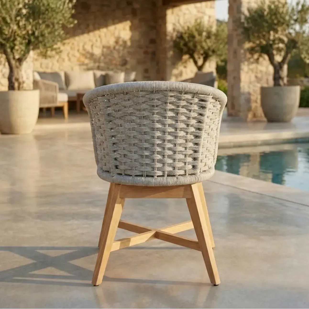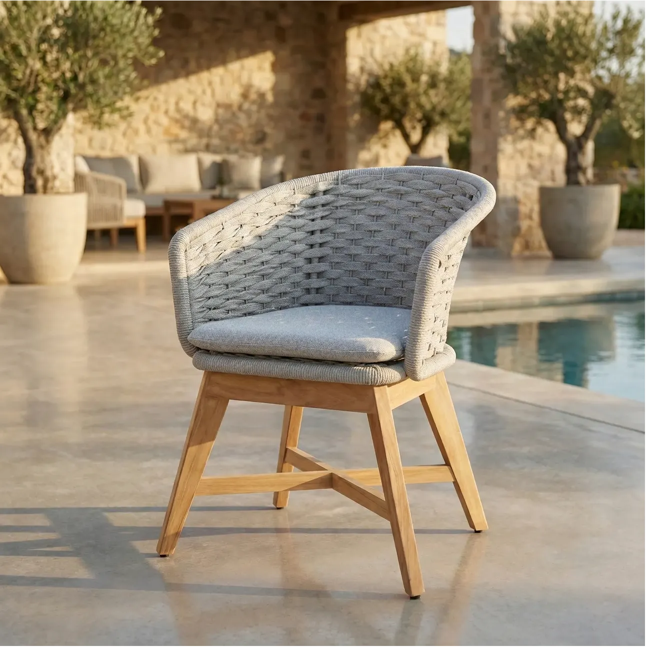 Goat Chair features a compact, grounded silhouette that emphasizes comfort and material strength. Crafted with a tightly woven rope shell, supportive seat cushion, and solid teak base, it offers a sense of enclosure, stability, and balance while maintaining a clean, contemporary appearance suitable for outdoor use.
