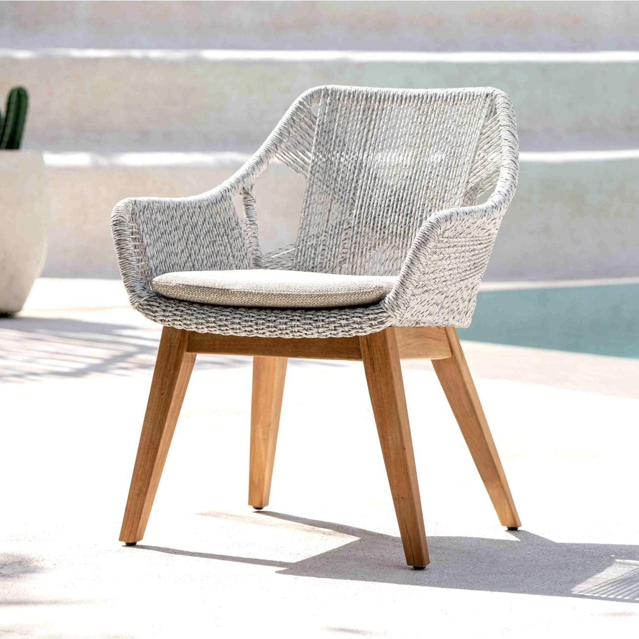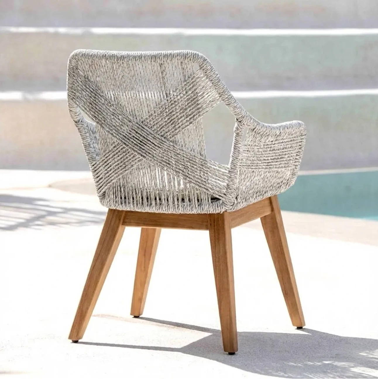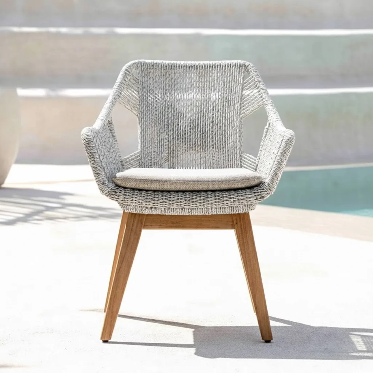 Kristin Chair brings a soft, contemporary expression to outdoor seating. Crafted with a finely woven rope structure, plush seat cushion, and solid teak legs, its enveloping form offers ergonomic comfort while balancing visual lightness, durability, and refined craftsmanship for everyday use.