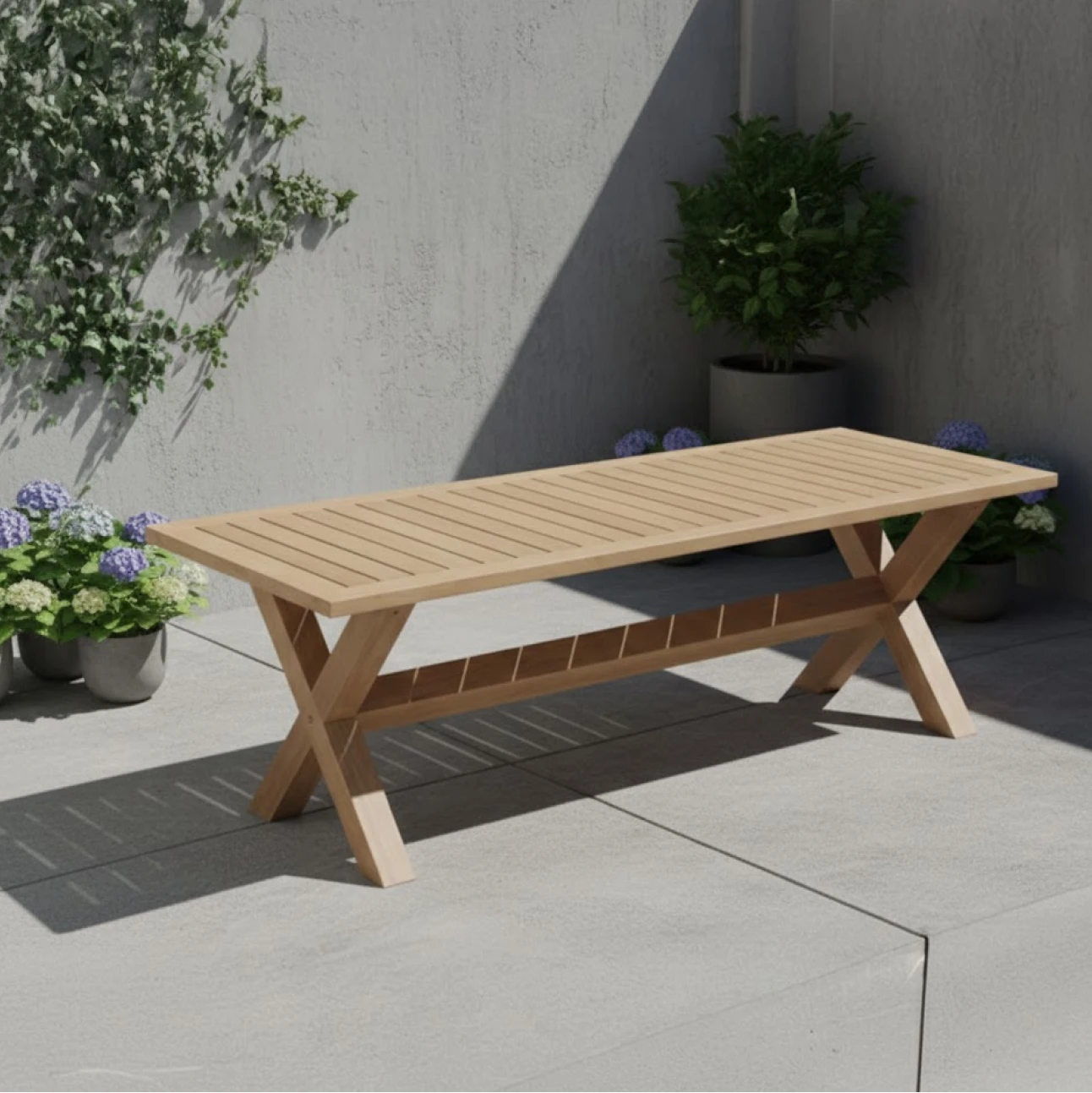 Ocean Rectangular Table features a clean linear silhouette that highlights material honesty and structural clarity. Crafted from solid teak, its slatted surface and cross leg construction deliver durability, stability, and a balanced presence suited to refined outdoor dining and everyday use.