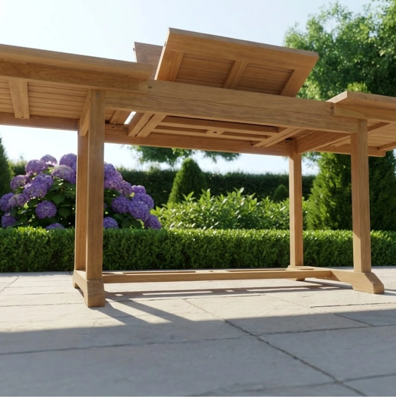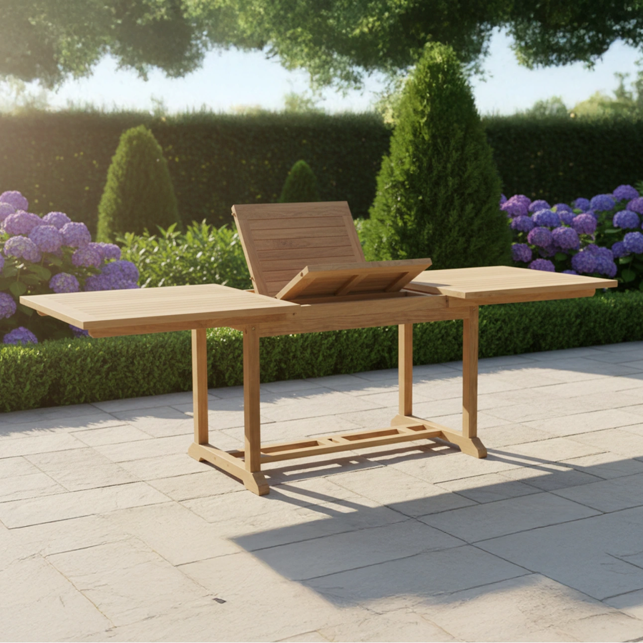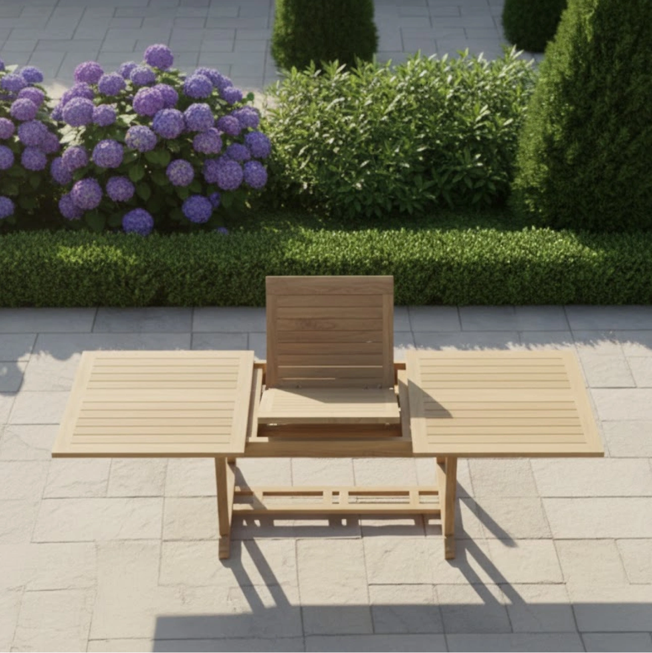 Rectangular Ext. Table features a clean, elongated rectangular form with an integrated extension system designed for adaptable outdoor dining. Crafted from solid teak, its slatted tabletop and sturdy straight-leg construction deliver durability, stability, and a refined visual balance.