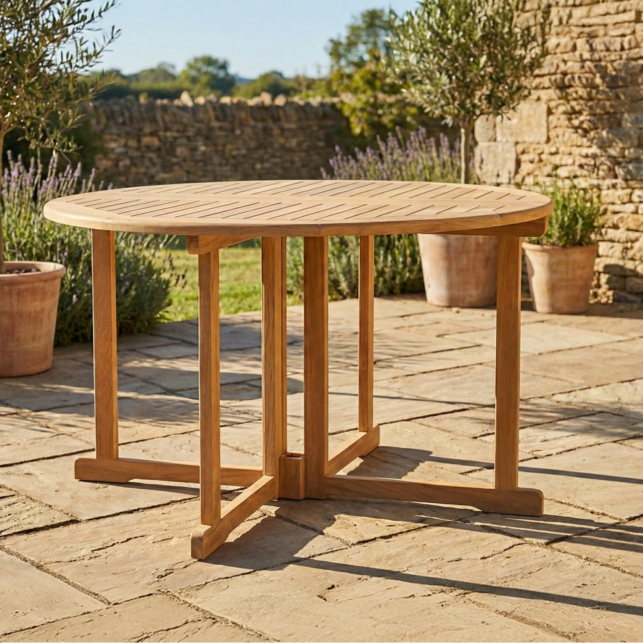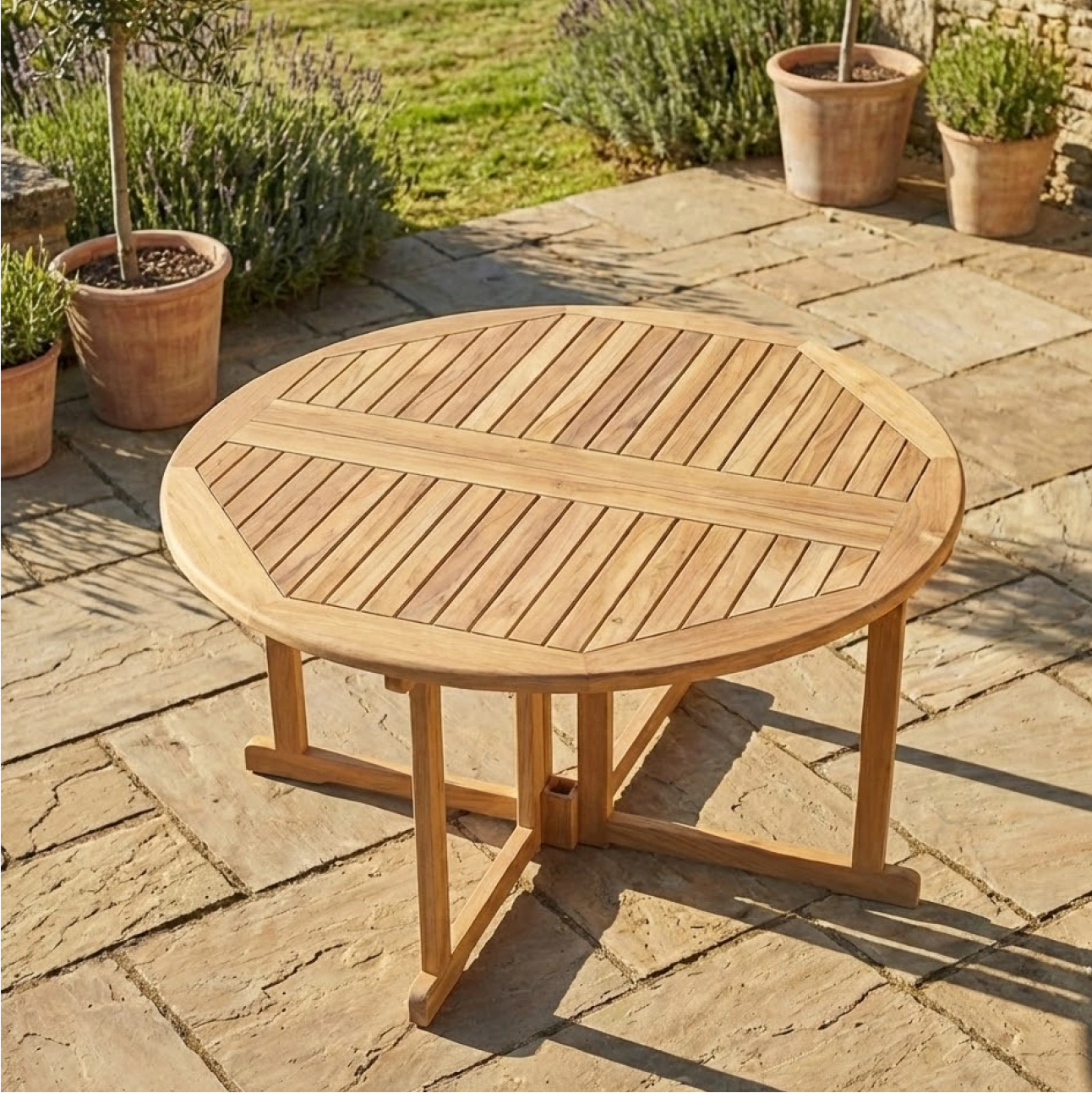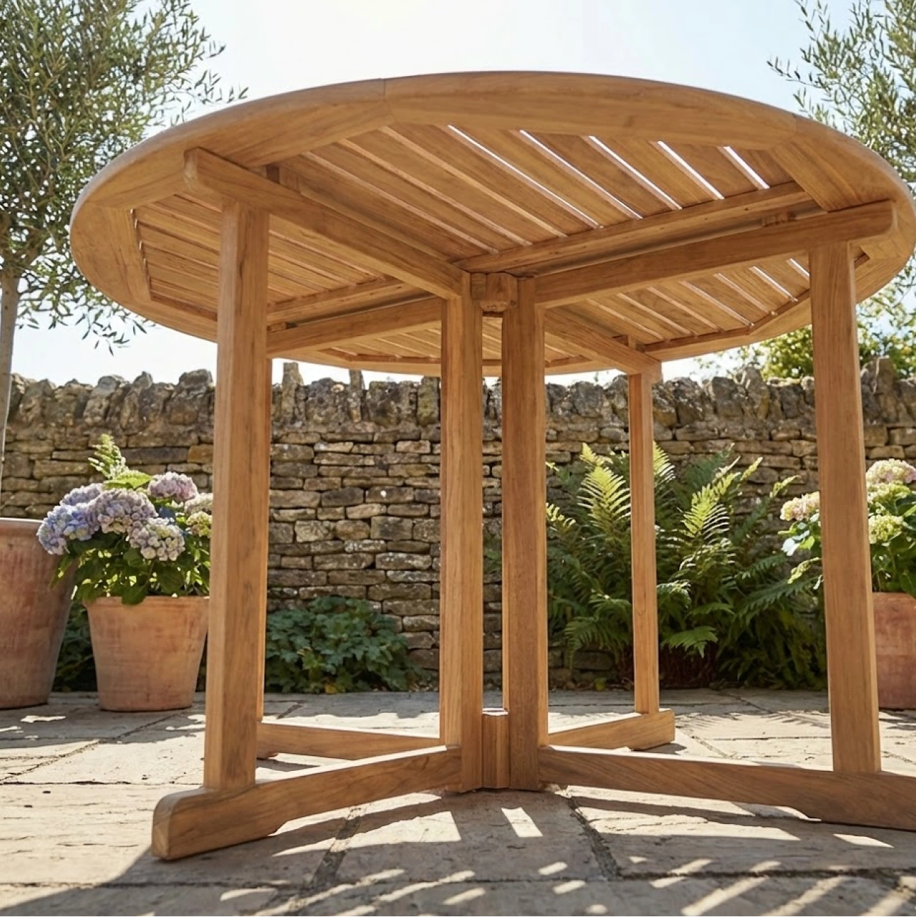 Round Butterfly Table features a balanced circular form that highlights material clarity and thoughtful construction. Crafted from solid teak, its slatted tabletop and central support structure provide durability, stability, and a refined visual rhythm suited to relaxed outdoor dining.