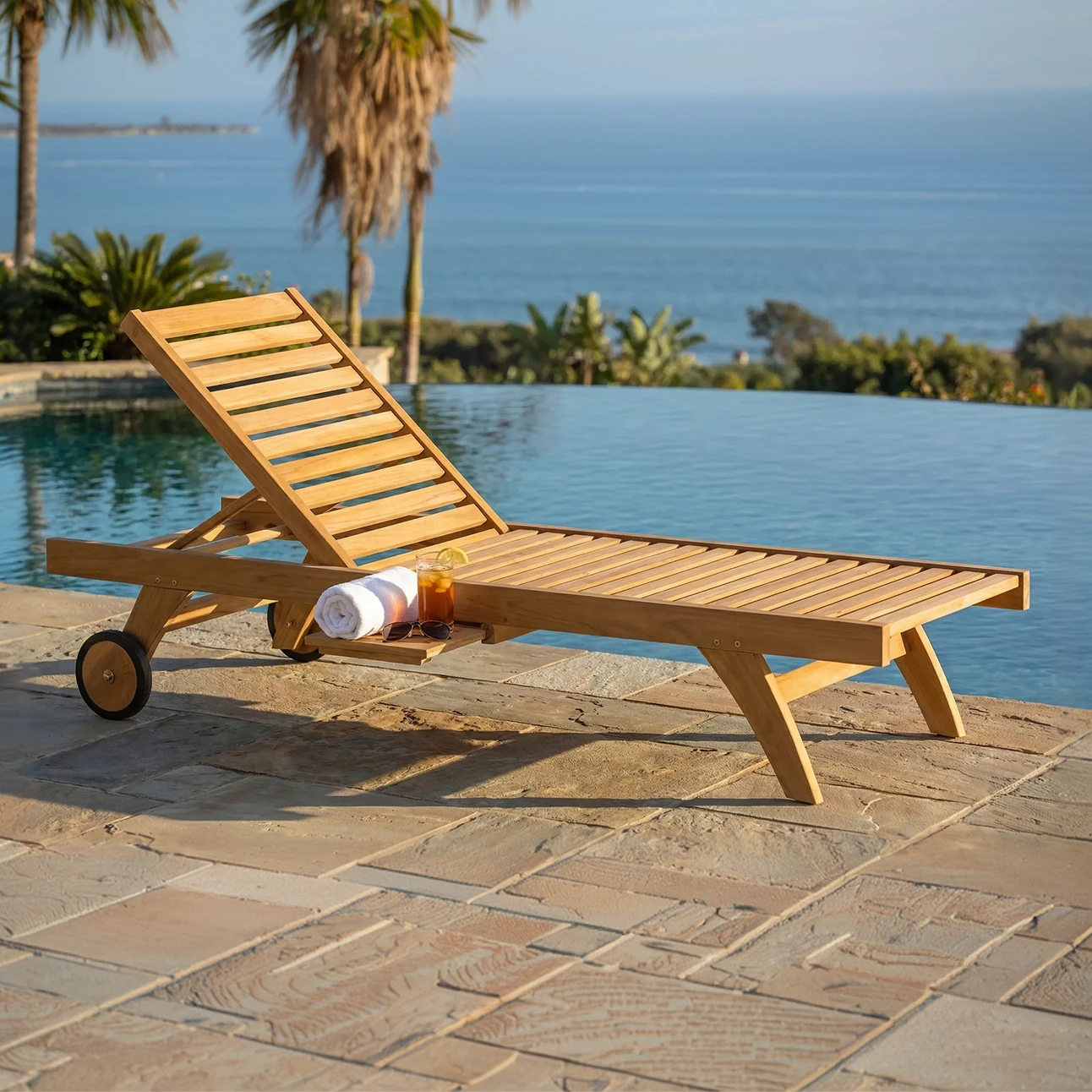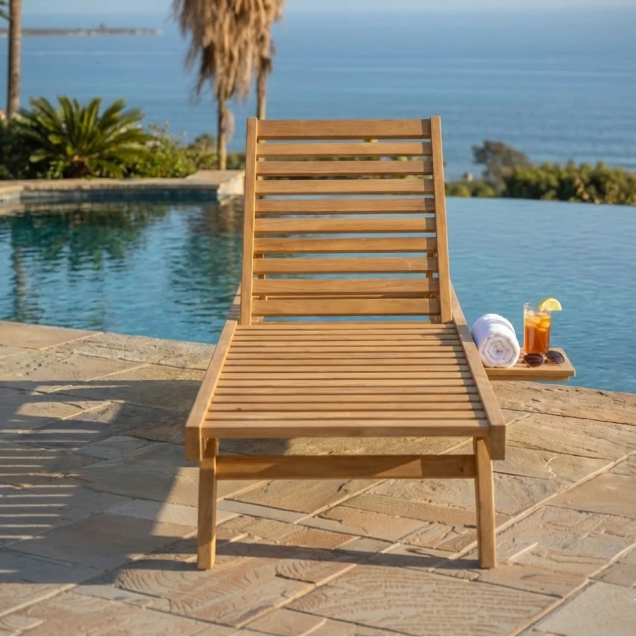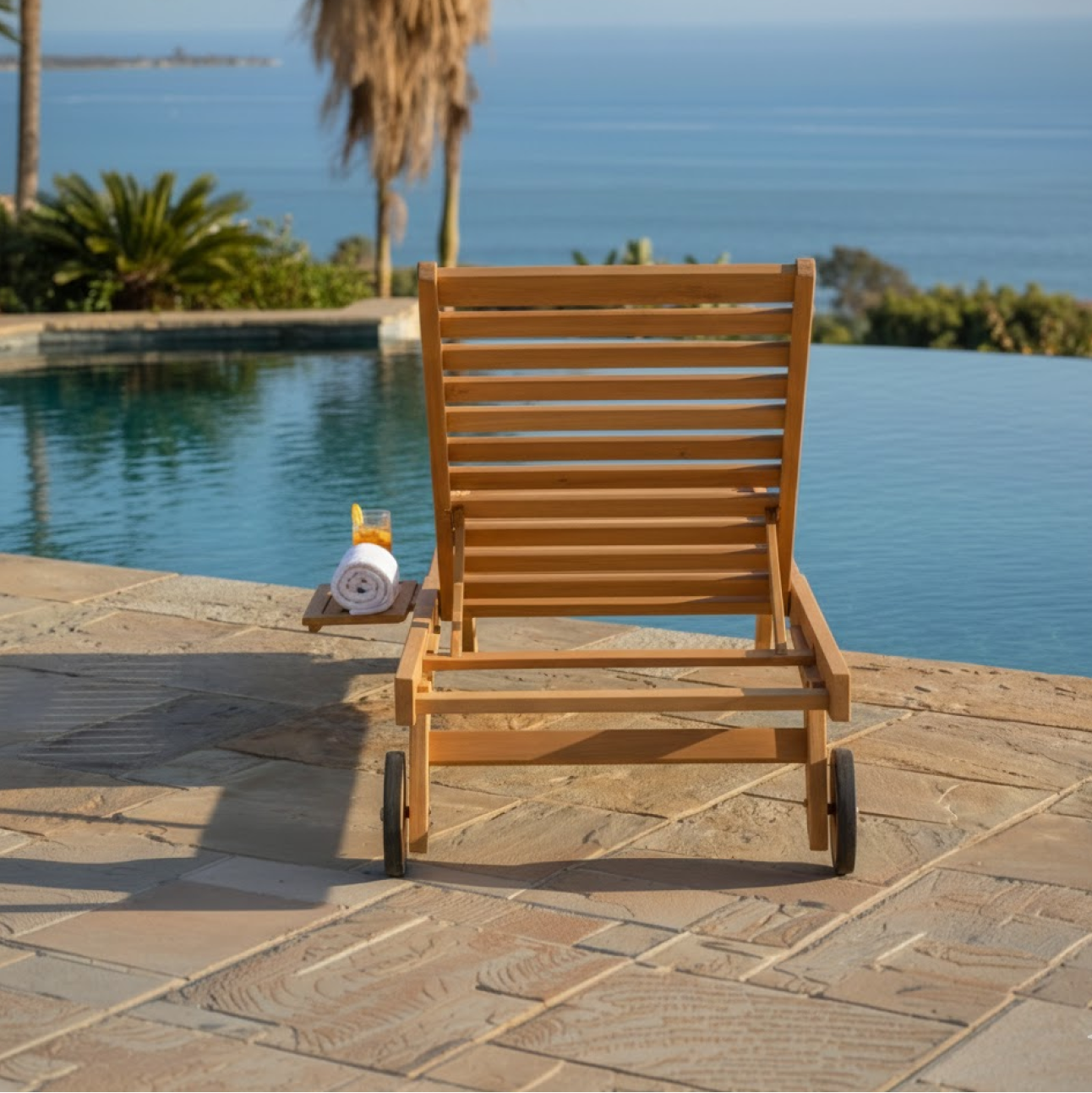 Sun Lounger features a clean, adjustable form designed for effortless outdoor relaxation. Crafted entirely from solid teak, its slatted surface promotes airflow while the reclining backrest allows multiple resting positions, combining durability, comfort, and a straightforward design suited for long hours outdoors.
