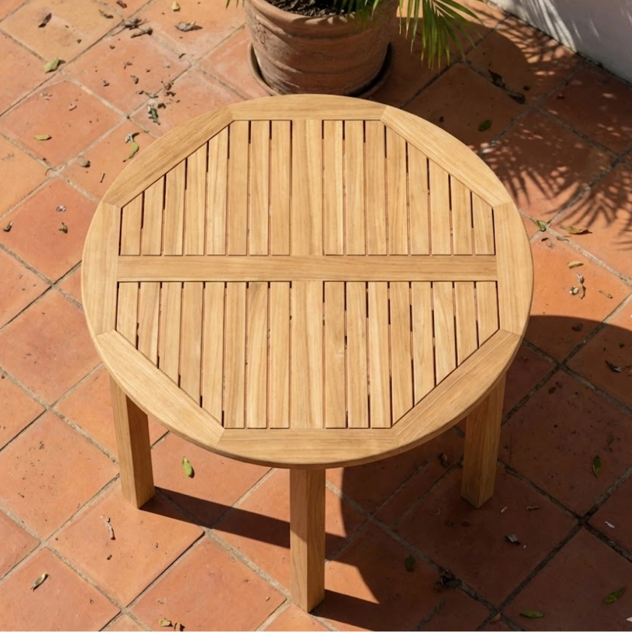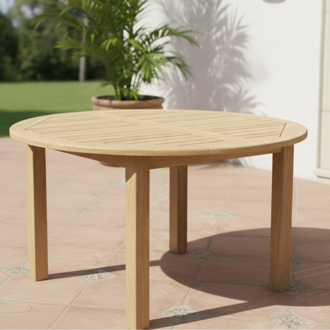 Sun Table features a simple circular silhouette that highlights material warmth and balanced proportions. Crafted from solid teak, its smooth round tabletop and sturdy straight legs provide durability, stability, and a refined presence suited to relaxed outdoor dining settings.