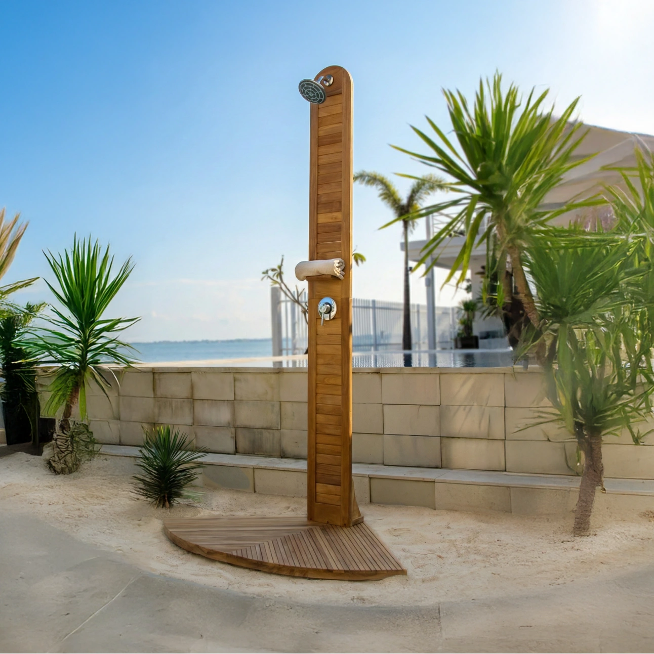 Teak Shower features a clean, vertical form crafted from solid teak, designed for outdoor use in poolside, garden, or coastal settings. Its slatted surface promotes quick drainage while the integrated shower fittings deliver durability, stability, and a refined natural presence in open-air environments.